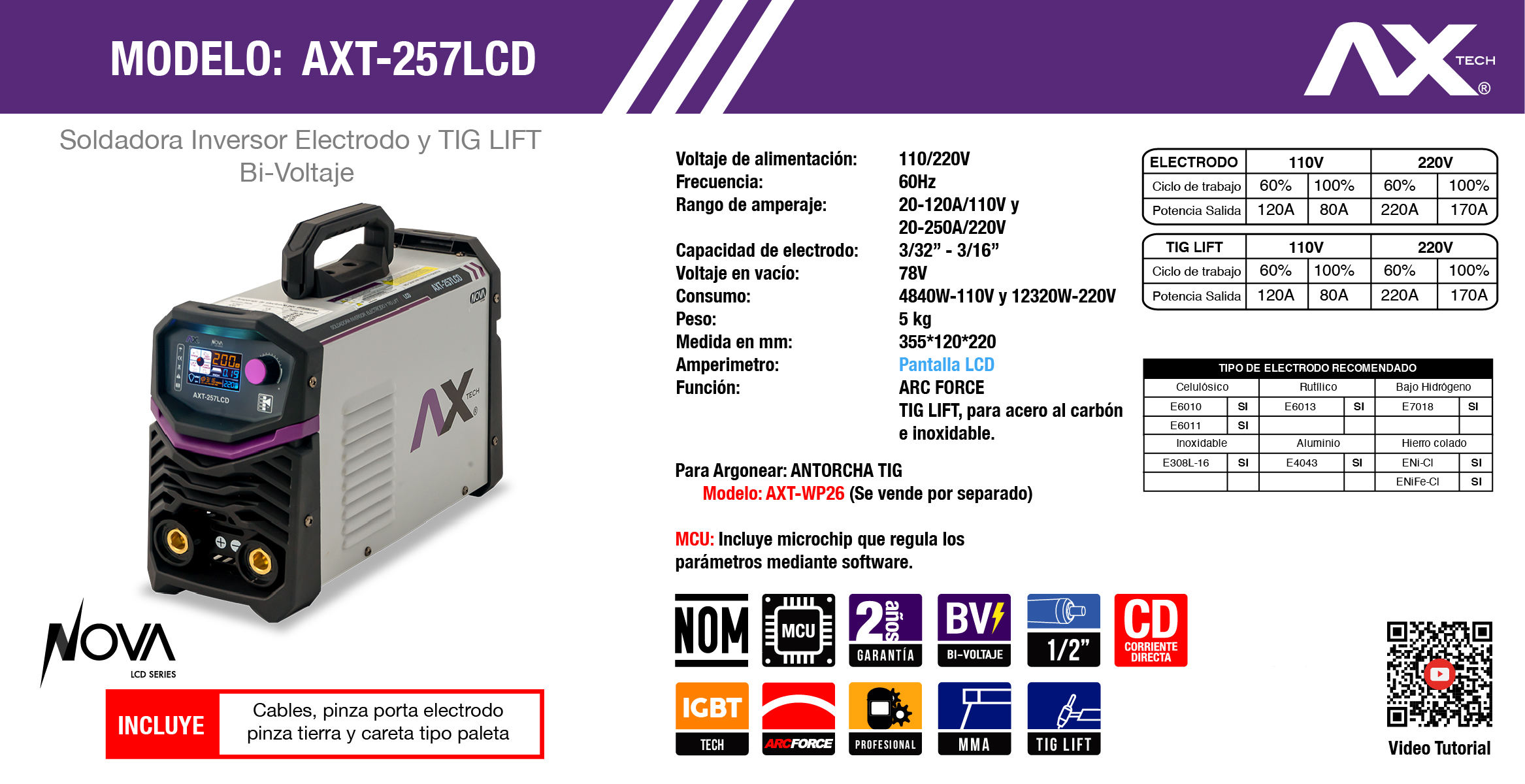 AXT-257LCD / Amperaje 20 – 120A @ 110V y 20-250A @ 220V / Electrodo: 3/16″ – 1/8″