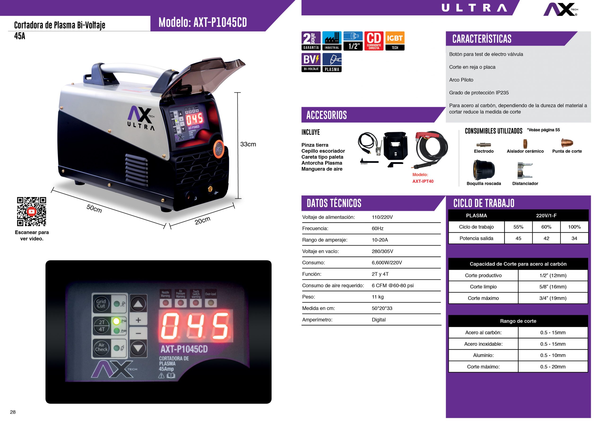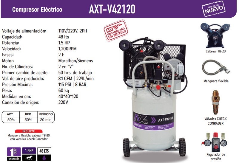 AXT-P1045CD / Capacidad: 72 Litros / Potencia: 3 HP/ Voltaje: 110V – 220V
