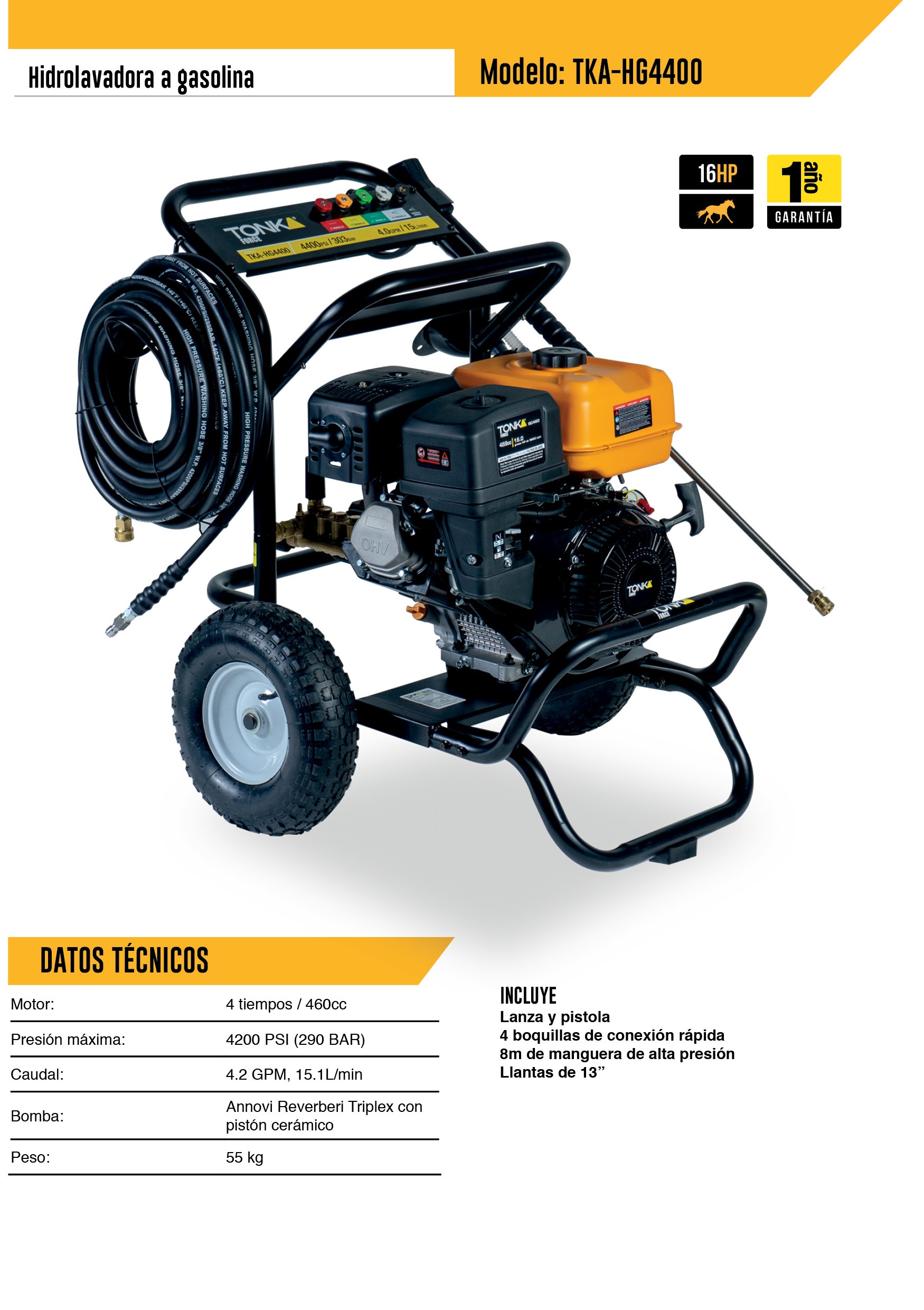 Motor: 4 tiempos Presión máxima: 4200 PSI (290 Bar) Caudal: 4.2 GPM, 16.2L/min Bomba: Annovi Reverberi Triplex con pistón cerámico.