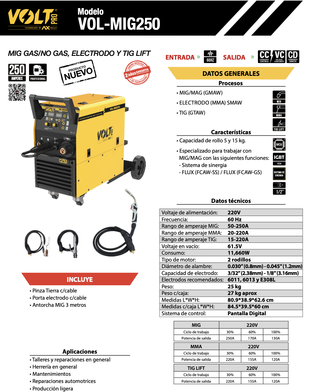 • Rango de amperaje MIG: 50–250A